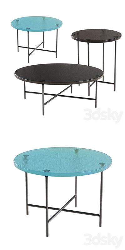 The coffee table on thin metal legs is made in a minimalist style. The round glass top is presented in a relief image giving it volume. The leg supports are interconnected by rungs that can serve as leg rests. Parameters 1∅450 h500, 2∅600 h400, 3∅800 h300, Polys-13 314